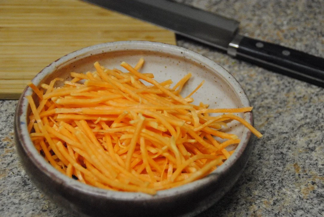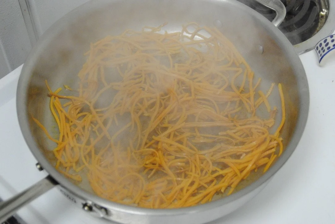 1. To prepare the sauce, combine and mix the soy sauce, sugar, sake, vinegar, and sesame oil until the sugar has dissolved. Next, peel and cut your sweet potato into thin strips. This can be done well with a knife, but I often use a mandolin with the julienne attachment for efficiency. The mandolin is one of my favorite kitchen tools, but can be dangerous if used improperly, so do what is best for you! You can also use a vegetable peeler to produce long strips of sweet potato, though this will affect the cooking process slightly.